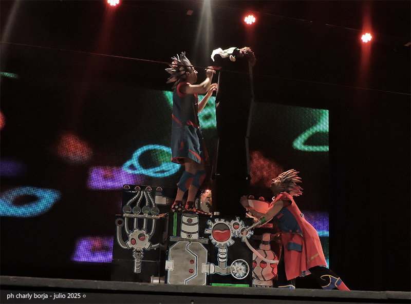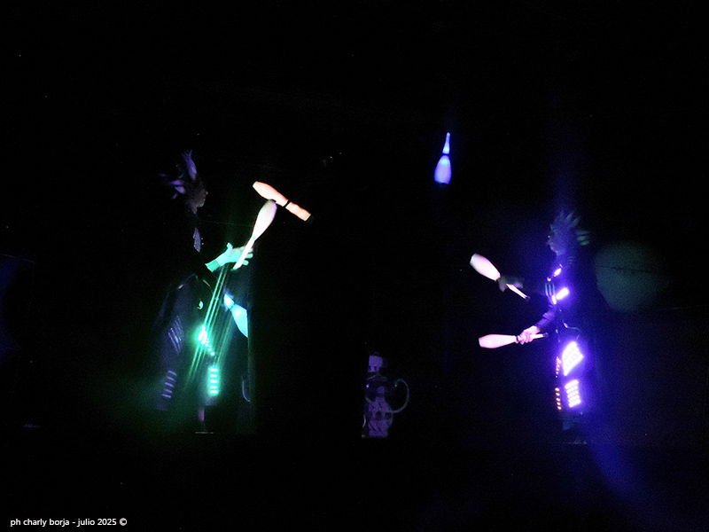 Nos sorprenden con un globo gigante que lo van conteniendo lentamente a Ignorabus hasta que lo hace desaparecer, sus extraños aparatos, sus riesgosos malabares con esferas de cristal y las pericias en el manejo magistral de los trompos aquel elemento de juego de tiempos pretéritos que el dúo reflota y actualiza.
