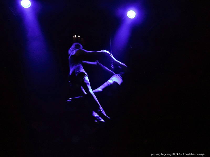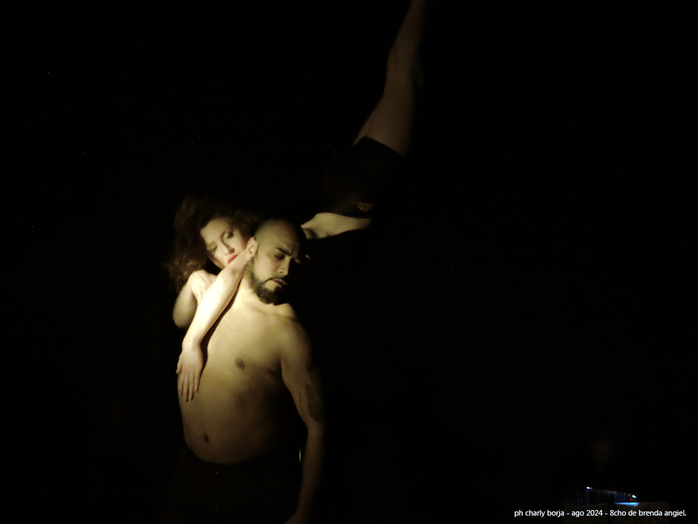 De qué se trata? Una nueva mirada sobre el tango, desde la danza como desde la música. Un espectáculo con trece artistas en escena, siete bailarines y seis músicos. Manteniendo la esencia del género rioplatense e inspirado en uno de los famosos pasos del mismo nombre, 8cho fue creado por la coreógrafa Brenda Angiel. Los bailarines suspendidos en sogas y arneses crean una nueva forma de espacialidad y un cúmulo de nuevas posibilidades para el tango; sin perder la sensualidad, la nostalgia, el humor y la fuerza expresiva del mismo. Los temas musicales originales y arreglos van desde tangos electrónicos, acústicos a tradicionales. La dirección musical es de Juan Pablo Arcangeli, (Integrante original de Astilleros) y Martin Ghersa. La orquesta está formada entre otros por el cantante Alejandro Guyot y excelentes músicos del género. La obra, que tiene un extenso recorrido por diversos festivales de Europa, USA y América Latina, a finales de setiembre se presentará en el Festival Internacional de Teatro del Pacífico, en el Teatro Marrinsky de la Ciudad de Vladivostok, Rusia. Este Festival es parte del Festival Internacional Chekov, el evento cultural más importante de Rusia.