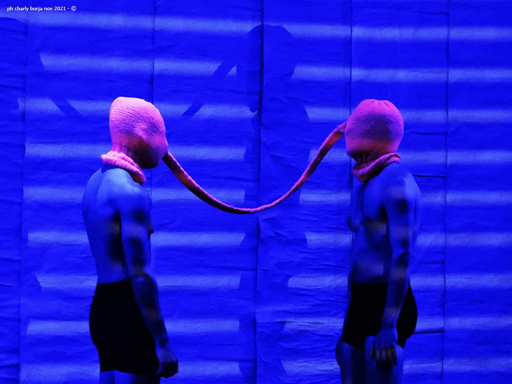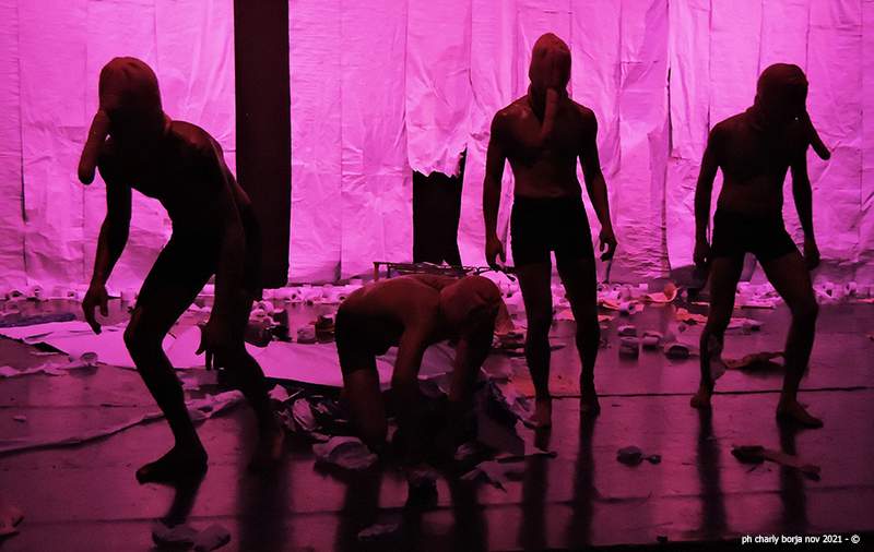 Está encarnada por cuatro bailarines (artistas repartidores de Rappi, artistas albañiles, migrantes, mestizos, precarizados), y recrea en escena una feria de curiosidades, mezcla de laboratorio, espacio público, disturbio popular, fábrica y casting. Las instalaciones escenográficas están construidas con material de descarte, a través de los cuales (junto a la danza, el teatro físico y las artes visuales) el recorrido de la pieza presentará parcialmente el algoritmo inscripto en nuestros cuerpos, hábitos e ideologías, desde los cuales se organizan nuestros consumos, luchas, sumisiones, deseos, sexualidad e imaginarios.