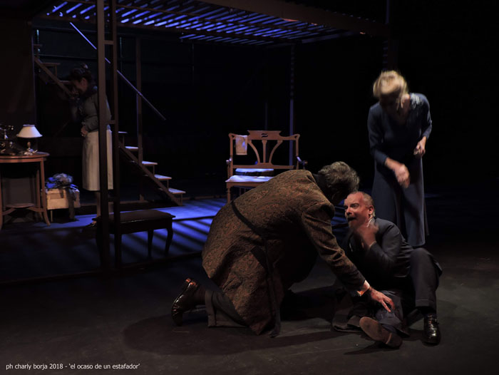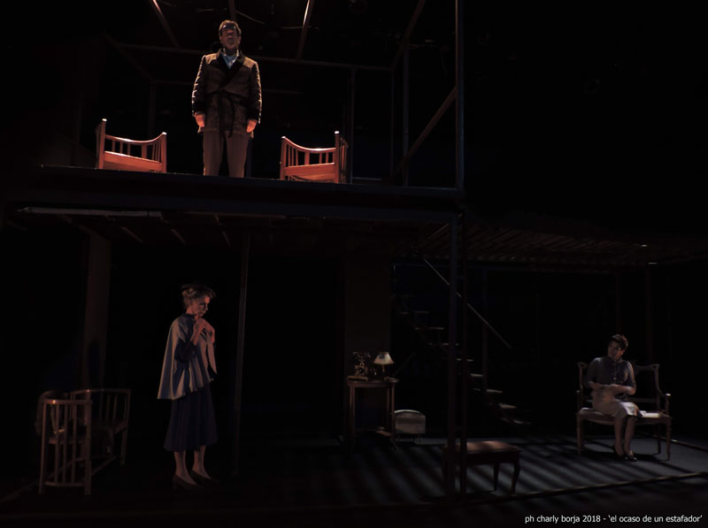 Juan Gabriel Borkman el protagonista de la historia magníficamente interpretado por Edgardo Moreira se encierra en sí mismo como si se protegiera de otros y de sí mismo, pasando a segundo plano en sus intenciones tanto su familia, como su amigo incondicional soberbiamente interpretado por un Alejo de Santis imperdible, y hasta del mismísimo nazismo que le impide seguir con sus planes de codicia, llegando al paroxismo al tener que soportar estoicamente la lluvia de bombas que caen sobre su casa que no parecen asustarlo de manera alguna.