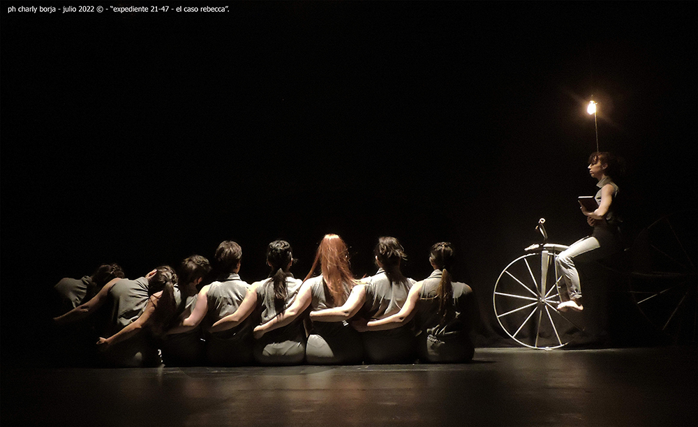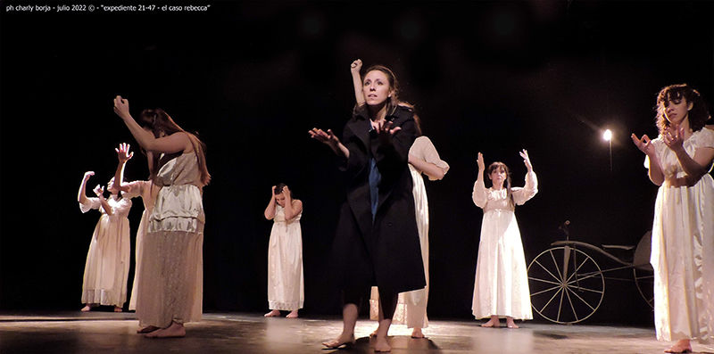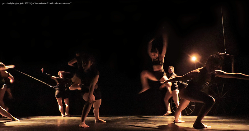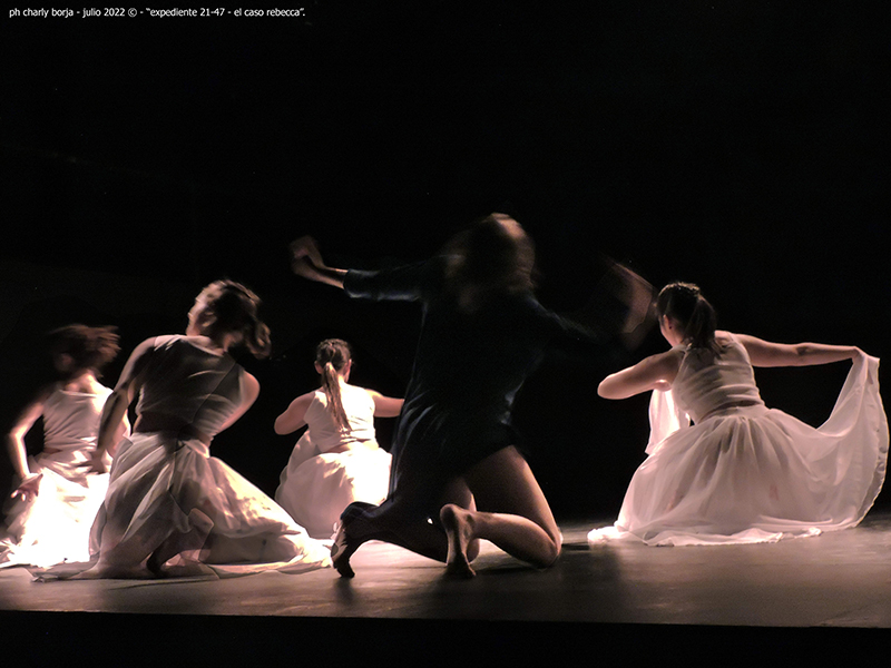 La opinión de charly Borja – julio 2022 © Interesante propuesta la del grupo MUKK dirigido por Estefania Miceli, en la que confluyen diferentes disciplinas artísticas como Danza-teatro-música-performance y artes audiovisuales, este combo estético enaltece la labor de la mujer en “ Expediente 21-47...el caso Rebecca”. Si bien existe una propuesta textual, la que predomina y le da al espectáculo su impronta más allá de las palabras son las expresivas coreografías que van contando la historia de una mujer llamada Rebecca que bien podría ser cualquier mujer de cualquier lugar del planeta.