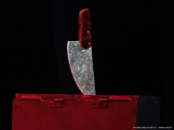 Teatro de vanguardia. Una puesta que juega con la sorpresa, dentro de una atmósfera densa en donde un filoso cuchillo de carnicero juega un papel importante y truculento.