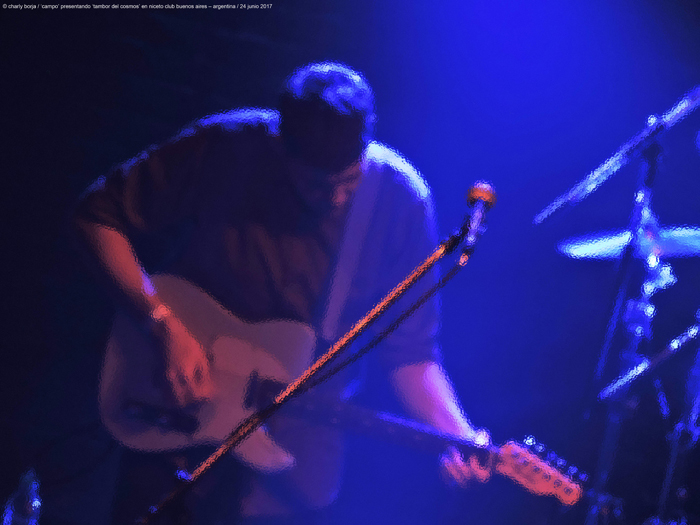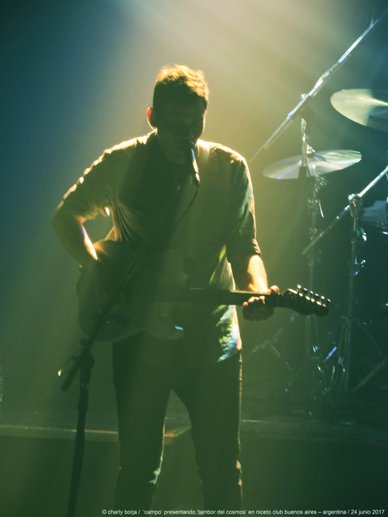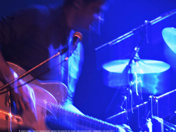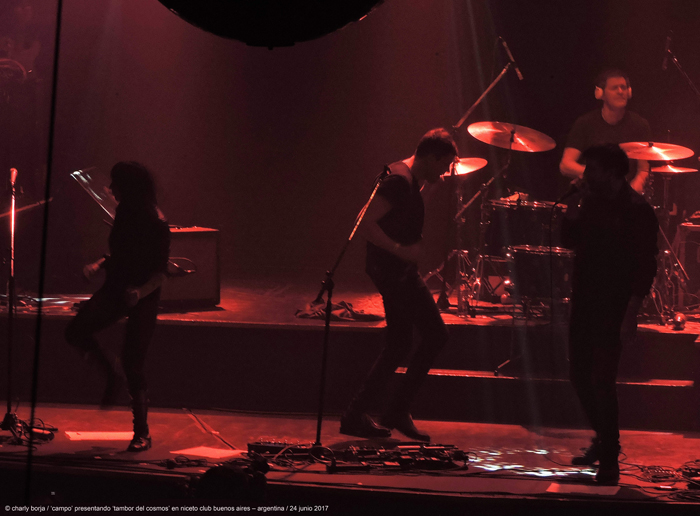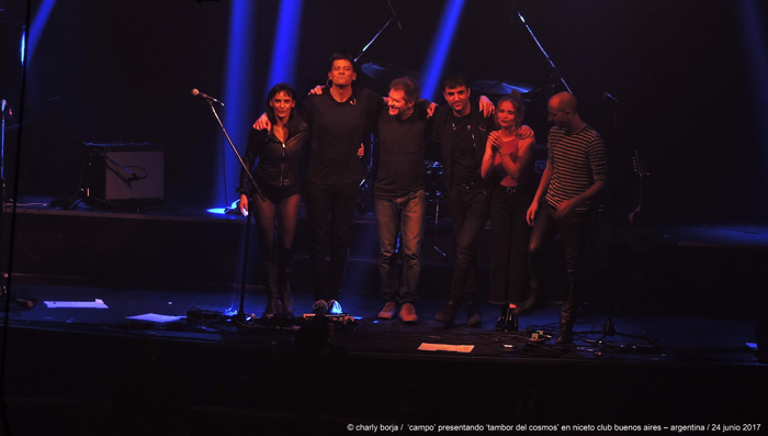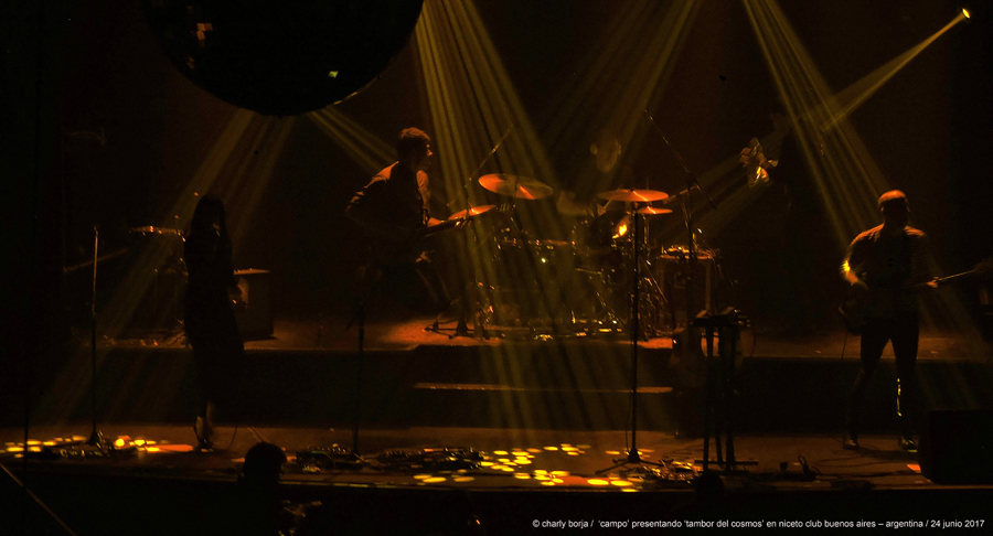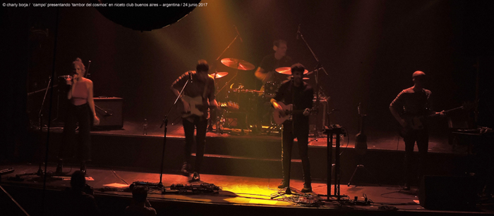 El Arte de tapa e interior es bello e ilustra perfectamente lo intrigante del tour por ese cosmos tan especial que nos propone Campo. El grupo va metiéndose el cosmos en su interior y haciéndose carne de ello sale de gira por lugares recónditos del alma hacia un amplio universo que ofrece al oyente transformarse en figuras tales como un pájaro libre en el viento perforando el tiempo y reflejándose sobre un espejo negro en el cielo que contrasta con un ardiente desierto rojo diciéndonos que inexorablemente en el corazón del grupo late un misterioso tambor del cosmos. Todo un viaje contado con una poesía de alto vuelo en un tema emblemático que da nombre al disco y que sugiere toda la estética de los Campo en su lírica en los temas cargados de sutiles arreglos instrumentales. En vivo en Niceto Club el grupo tuvo cuidada estética en la iluminación tenue y sonó compacto pero no como una bola de sonido, por lo tanto se pudo gozar muy bien del sonido de cada uno de los instrumentos, desde ‘el muro’ que conforma la batería de Roberto Rodino, el bajo y los sutiles sonidos emitidos por teclados y máquinas del inspirado Boni, la bella voz de verónica loza y la versatilidad del cantante Martín Rivero, todo ello unido y amalgamado por los exquisitos toques de guitarra eléctrica con una pedalera munida de todo un arsenal de efectos sonoros capitaneada por el gran Juan Campodónico. En fin fue toda una fiesta escuchar a los Campo en vivo.