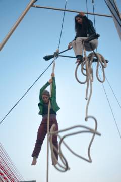 Droop + Just a ride Belgica - Alemania / Compagnie du Cardage Circo coreográfico Dos mujeres suspendidas por tres cuerdas bailan todas sus dudas, interrogando la paradoja que nos hace viajar entre la fuerza y fragilidad. Un espectáculo atemporal y femenino que crea una burbuja que abarca a las artistas y al público a través de una disposición circular y un sonido intenso, una atmósfera íntima en ”gran escala”, una intimidad compartida. El tiempo pasa y empuja al olvido. Aquí sentadas y exaustas, Me hundo en el polvo que cae obstinadamente de tus hombros. Y nos quedamos solas, juntas. Nos entrelazamos. Cuenta con el apoyo del WBI JUST A RIDE