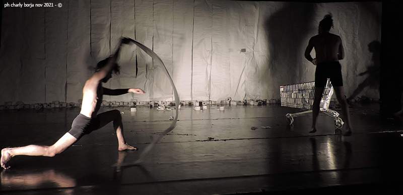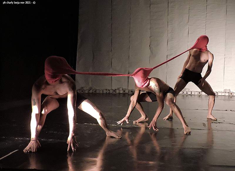 Está encarnada por cuatro bailarines (artistas repartidores de Rappi, artistas albañiles, migrantes, mestizos, precarizados), y recrea en escena una feria de curiosidades, mezcla de laboratorio, espacio público, disturbio popular, fábrica y casting. Las instalaciones escenográficas están construidas con material de descarte, a través de los cuales (junto a la danza, el teatro físico y las artes visuales) el recorrido de la pieza presentará parcialmente el algoritmo inscripto en nuestros cuerpos, hábitos e ideologías, desde los cuales se organizan nuestros consumos, luchas, sumisiones, deseos, sexualidad e imaginarios.