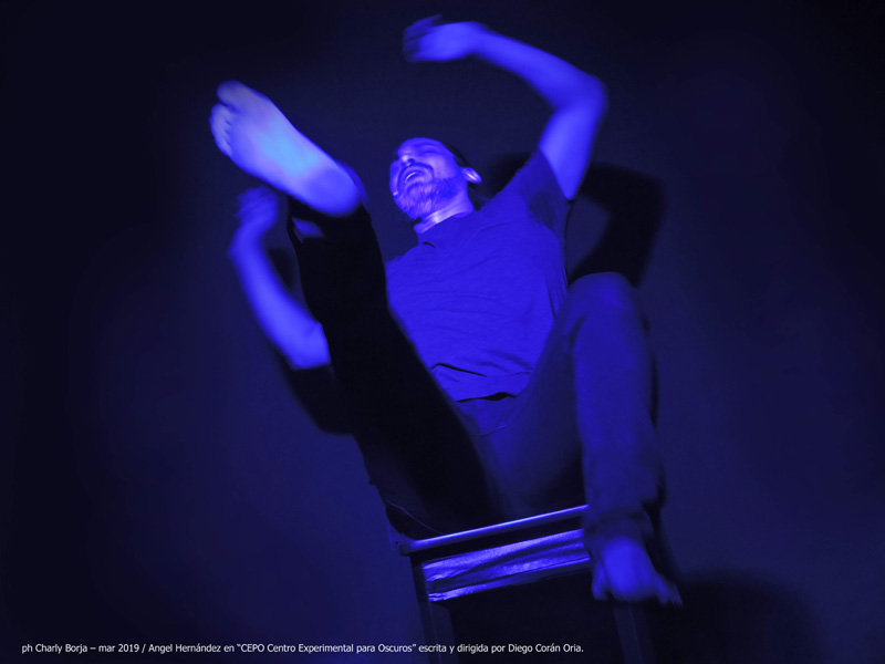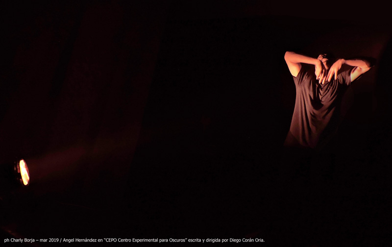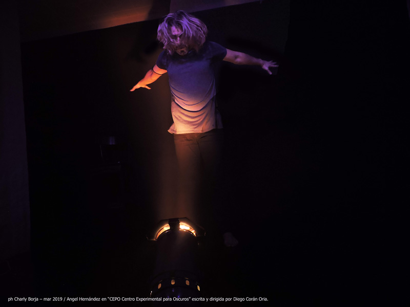 La opinión de charly borja - marzo 2019 © Hemos disfrutado de una experiencia innovadora dentro de los espectáculos stand-up que tanto pululan en la ciudad de Buenos Aires, se trata de la nueva creación del inquieto Diego Corán Oria llamada “CEPO - Centro Experimental para Oscuros” también dirigida por él en donde el joven Angel Hernández en excelente performance nos brinda una demostración de actuación, canto y destreza física en su extraño personaje llamado Angel para contar su historia a través de diferentes vivencias que le va exigiendo el enigmático proyecto CEPO. Munido de una batería lumínica que presenta la característica de no estar visible al espectador sino que se representa a través de contraluces y proyecciones sobre paredes de tela haciendo más vibrante los episodios que Angel nos quiere contar, constituyendo una imaginativa puesta.